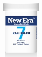 NEW ERA TISSUE SALTS NO 7 KALI SULPHATE 240T Description: Maintains skin condition. Minor skin eruptions with scaling or sticky exudation. Brittle nails. Catarrh. Ingredients: 6X KALI. SULPH. Potassium Sulphate Directions: Adults: Dissolve 4 to 8 tablets on or under the tongue 3 times per day. Children to 12yrs: Half dosage. These may safely be taken with other supplements or medicines.
