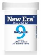 NEW ERA TISSUE SALTS NO 9 NAT MUR 240T Description: Distribution in body water. Watery colds with flow of tears and runny nose, loss of smell or taste. Ingredients: 6X NAT. MUR. Sodium Chloride Directions: Adults: Dissolve 4 to 8 tablets on or under the tongue 3 times per day. Children to 12yrs: Half dosage. These may safely be taken with other supplements or medicines.